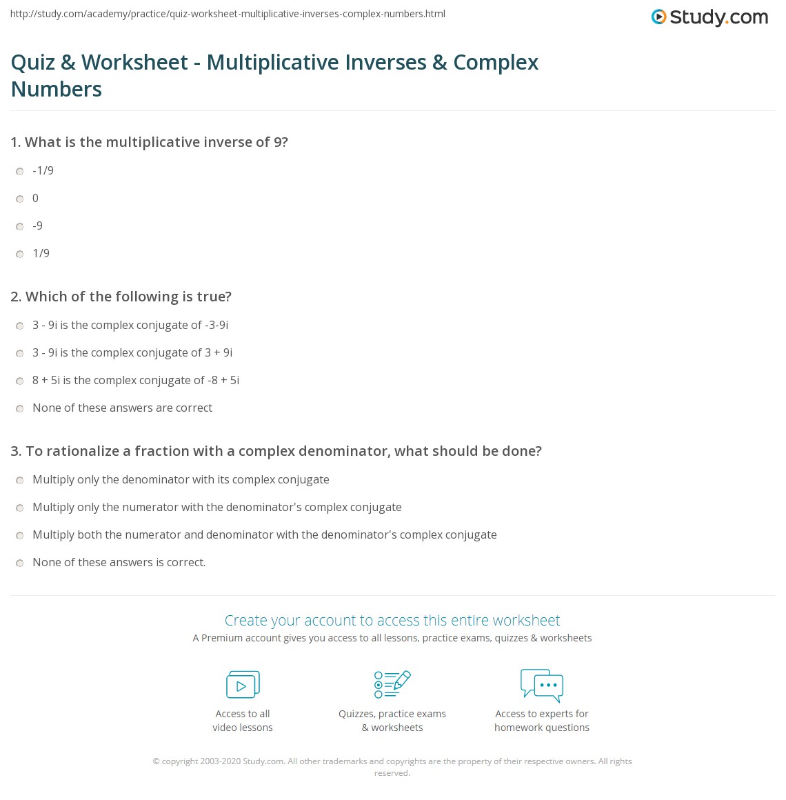 12 is on complex numbers (imaginary numbers introduction,. For this complex number worksheet, students explore the properties of imaginary numbers to find the square roots of negative numbers. Write the conjugate of each. The letter i used to represent the imaginary unit is not a variable because . 2) 3 + 4 + 6i. It has a real part of π and an imaginary part of 0. The lesson covers the basic definition of the imaginary number, simplifying radicals . Yes, π is a complex number. All imaginary numbers and the set of all real numbers is the set of complex. There is a link to free pdf worksheets with constructed response questions . Worksheet by kuta software llc. The reason for the introduction of complex numbers is so that every quadratic equation will have a solution. A complex number is a number that can be expressed in the form a+bi, where a and b are real numbers, and i is the imaginary unit (which .